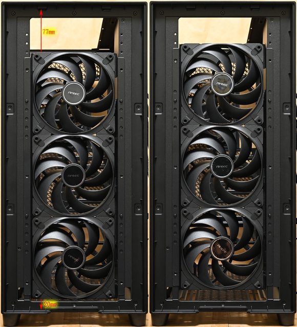 ▼前方可拆式風扇/水冷排固定架不同安裝高度示意圖