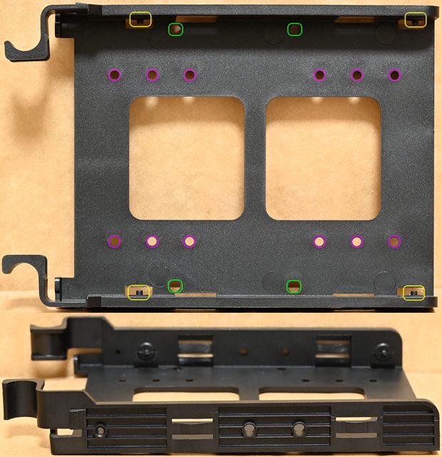 ○底部3.5吋/2.5吋活動固定架提供2個3.5吋/2.5吋安裝位置,主機板底板背面提供2個