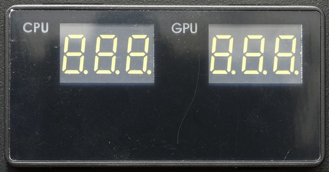 ●左側下方的白光七段顯示器可同時顯示CPU和GPU溫度,並可透過機殼頂部按鈕切換及關