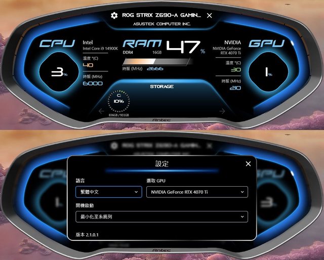 號/溫度/時脈。按下右上齒輪圖示可進入設定頁面,可選擇語言、監控GPU選擇、軟體啟