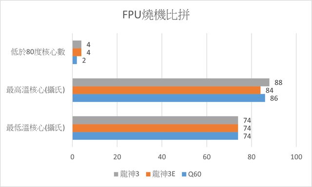 8顆P核中,烤FPU10分鐘後龍神3系列有半數核心可以壓在80度以下