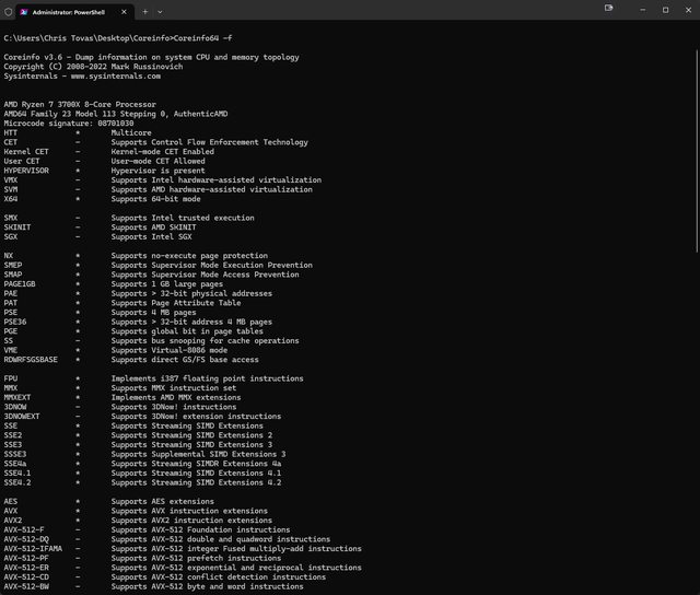 使用者也能透過coreinfo來檢視目前CPU可模擬和相容的指令集