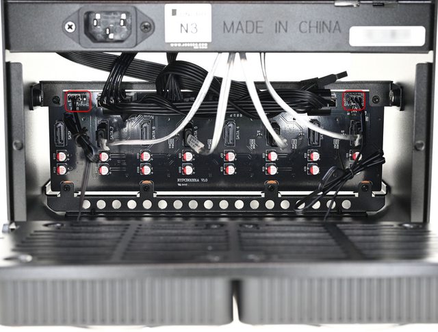 ▼裝回100mm風扇固定板前先連接2個風扇3pin連接器(紅框),並注意線路收納整理,不要