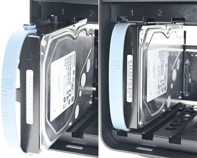 ▼8個3.5吋抽取槽採用無框架設計,使用導軌及墊圈固定3.5吋裝置