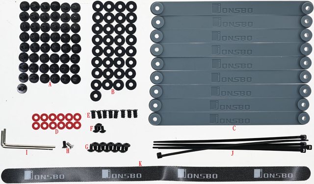 螺絲(H)、六角扳手(I)、塑膠束帶(J)、魔鬼氈束帶(K)