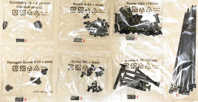 絲(C)、電源螺絲(D)、2.5吋裝置螺絲(E)、電源艙頂部風扇專用長螺絲(F)、塑膠束帶(G)