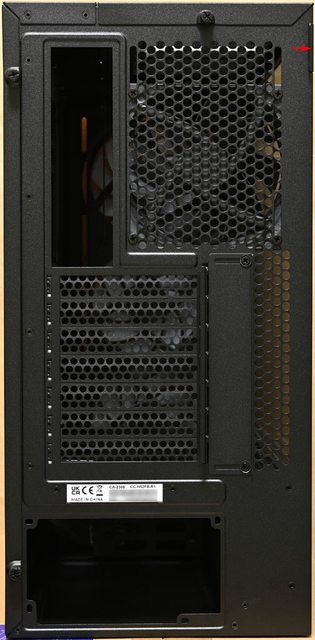 ▼後方右上有打開左側板的施力位置(紅色箭頭),圓形孔洞網狀通風口的長條形固定孔可