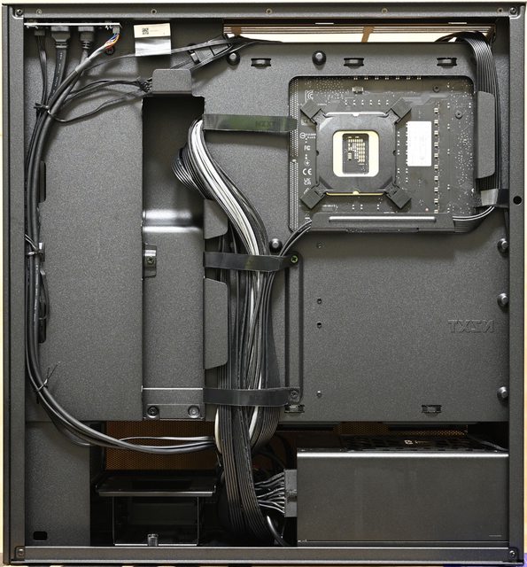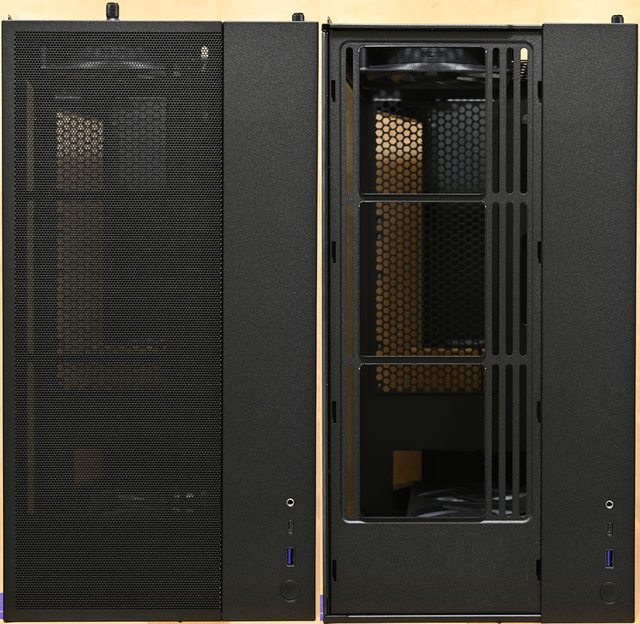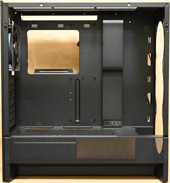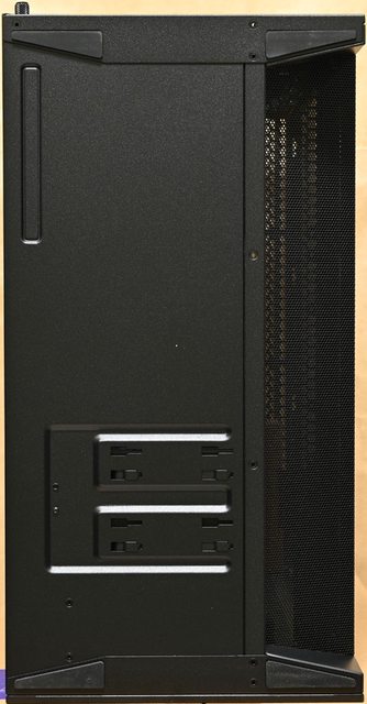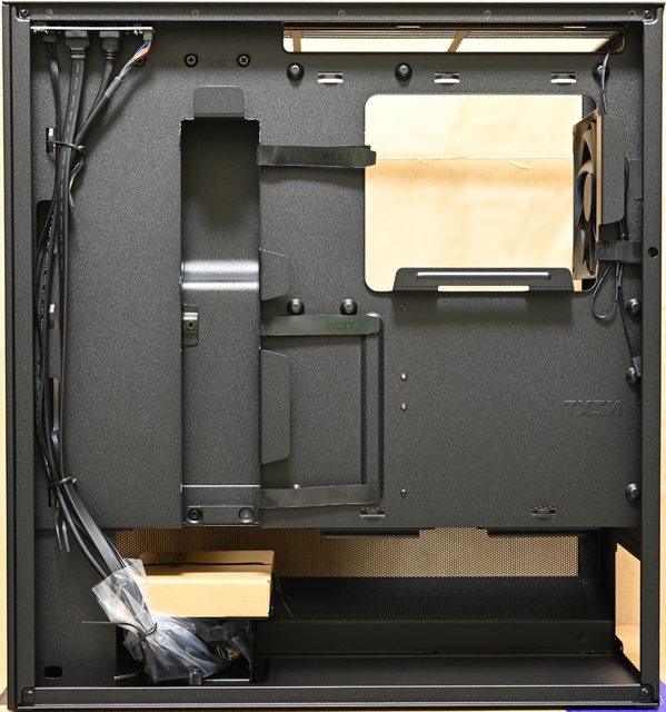 ▼左側配置圖,主機板底板上方鏤空,方便拆裝CPU散熱器背板,前方風扇側面有2個穿線