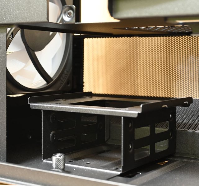 ▼前方網孔板使用卡榫固定,免用工具即可拆卸,固定孔可裝3個120mm或2個140mm風扇,