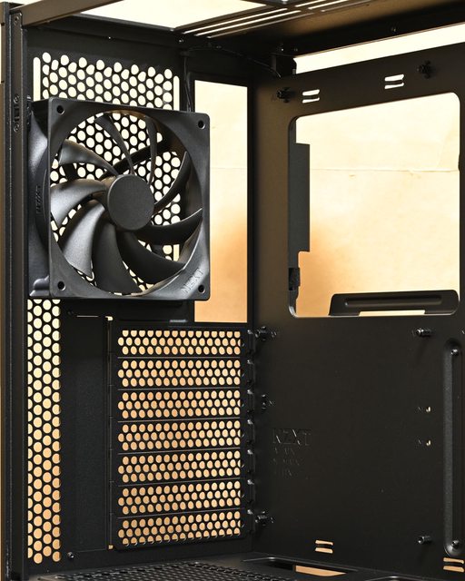 ▼後方預裝1個機殼版F120Q風扇,7個標準擴充槽之間沒有支架,不用擔心會阻擋介面卡