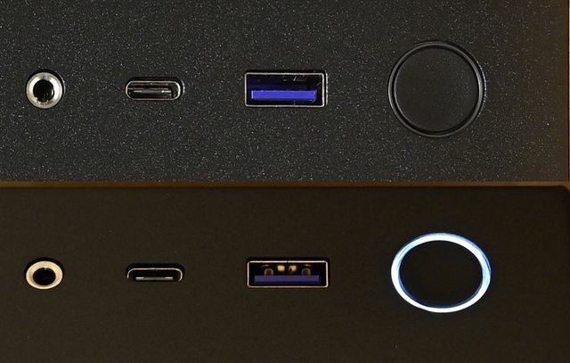 ▼頂部右前方由前(圖右)至後(圖左)分別是電源按鈕/指示燈、USB3.2 Type-A、USB3.2