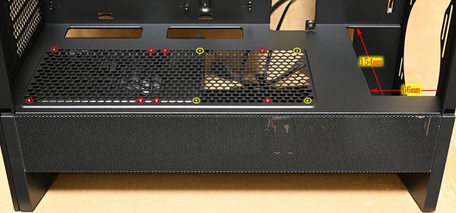 ),其中1個風扇可以更改安裝位置(黃框鎖點)。電源艙前端開口大小154×66mm