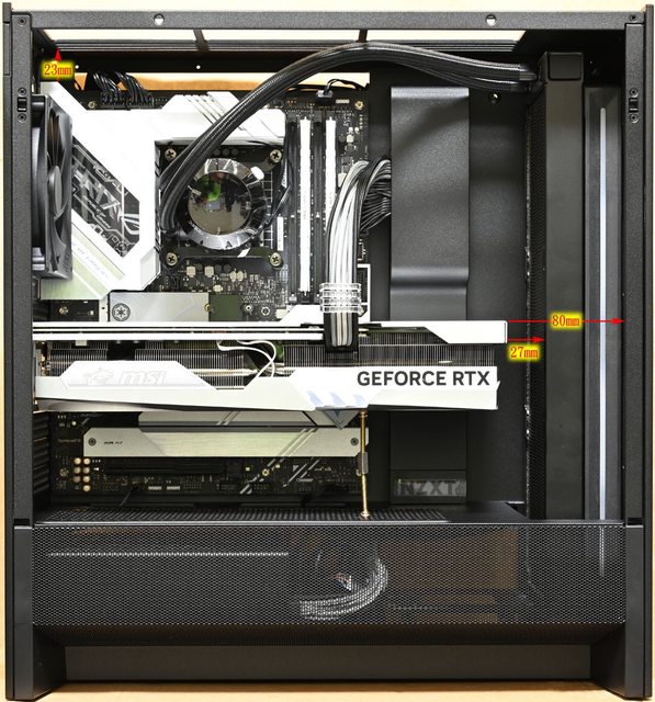 端距離前方風扇固定孔80mm,顯示卡前端距離水冷排27mm。主機板後方I/O埠裝飾蓋距離
