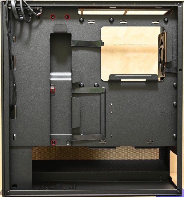 ▼電源艙頂部靠近底板有2個穿線開口,電源艙頂部網狀區域可裝2個120mm風扇(紅框鎖點