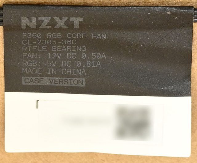 ▼機殼版F360 RGB Core單框3扇葉發光風扇於電源線路上的標籤,有商標、名稱、型號、
