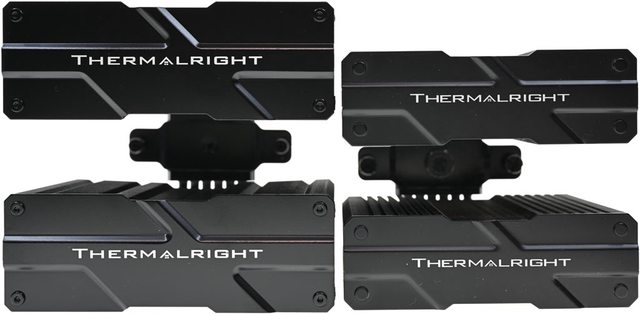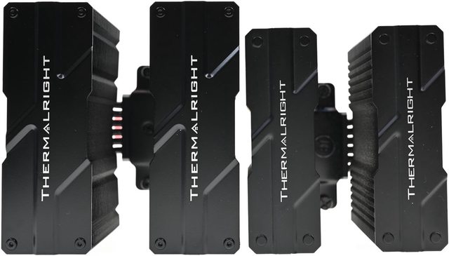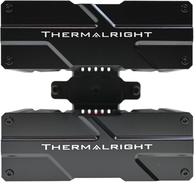 ▼雙塔頂部用黑色鉚釘固定的黑色金屬裝飾蓋有THERMALRIGHT商標名稱及造型