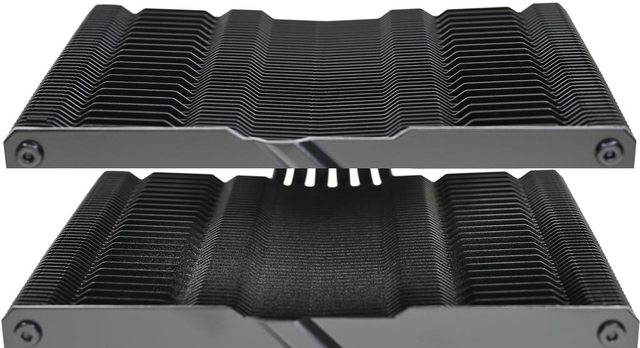 ▼散熱器本體採雙塔設計,底座兩邊各伸出6支熱導管,並在熱導管上安裝48片鰭片(含最