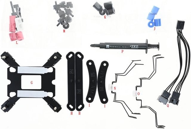 線扣(N)、TL-C12B V2風扇固定線扣(O)、TF7散熱膏(P)、1對2風扇分接線(Q)