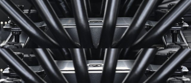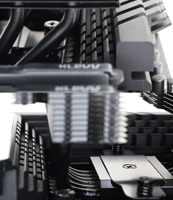 ▼從側面看,前塔及後塔下方7片散熱鰭片縮小,提供記憶體閃避空間,壓板中間用1個皿