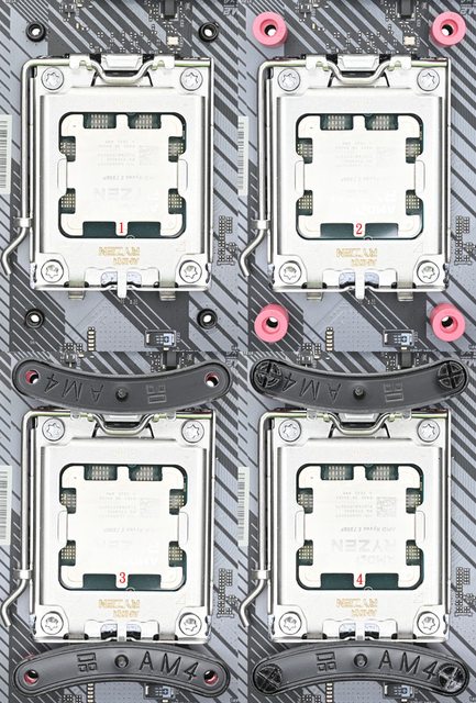 ▼將主機板原裝散熱器托架拆除,只保留原裝散熱器背板(1),將4個AM5/AM4紅色套管套