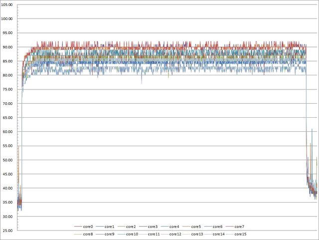 ▼功耗限制220W下高負載30分鐘CORE TEMP溫度記錄圖