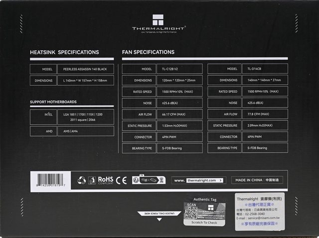 ▼此面外盒有散熱器尺寸、支援平台、TL-C12B V2及TL-D14CB風扇規格、條碼、認證標誌