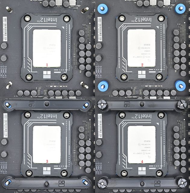 LGA1851/1700藍色套管套上固定螺柱(2),放上Intel托架(3),用4個Intel托架固定手轉