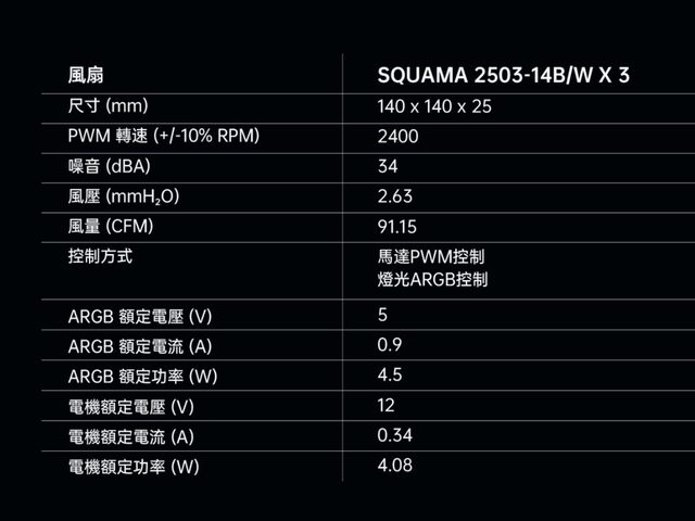 搭配的風扇是幾何未來自家的SQUAMA 2503 140mm風扇,有單獨販售,且有黑白兩色及正