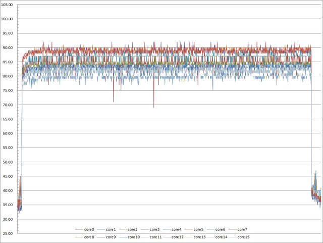 ▼功耗限制260W下高負載30分鐘CORE TEMP溫度記錄圖