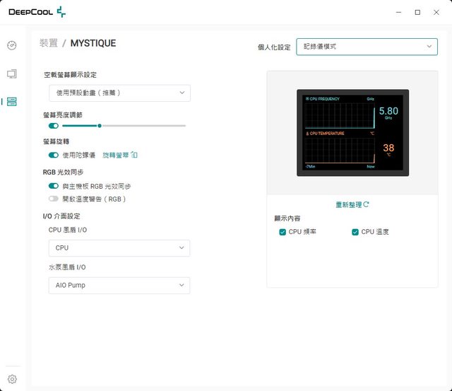 式可自訂顯示JPG或GIF檔案,將ARGB燈光設為螢幕邊緣色彩同步。記錄模式可將CPU頻率