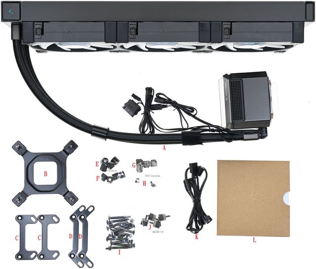 ▼包裝內容有一體式水冷散熱器(A,已預裝3個FD12 ARGB風扇)、Intel背板(B)、AMD托架