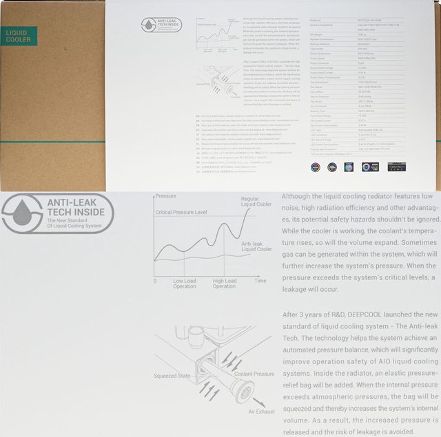 ▼外盒背面左上有LIQUID COOLER字樣,彩色印刷外套背面有防漏技術說明、多國語言"如