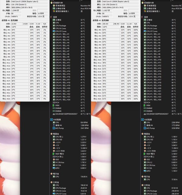 ▼功耗限制260W下待機(左)及高負載(右)的CORE TEMP及AIDA64感測器畫面