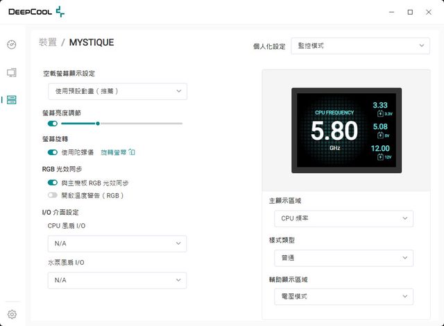 右下可設定主顯示區域(CPU頻率、時間、水泵轉速、CPU風扇轉速、CPU風扇轉速+水泵轉