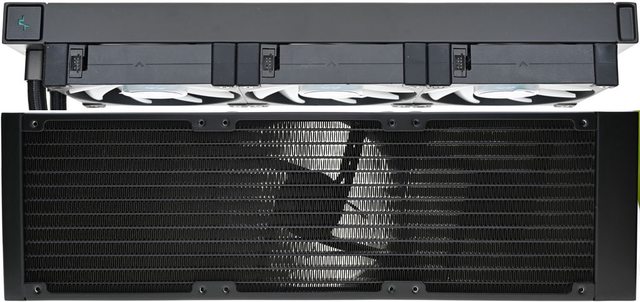 ▼鋁製水冷排尺寸402×120×27mm,進/出水管位於同一側,預裝3個FD12 ARGB風扇