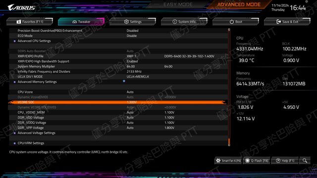 當記憶體為128GB/192GB時,建議 VCORE SOC 調整範圍 1.2V~1.3V,Infinity Fabric