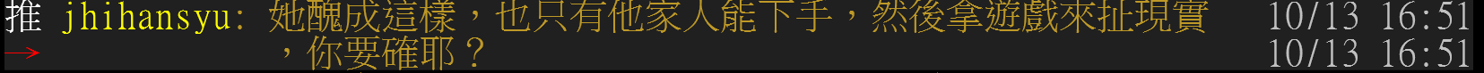jhihansyu: 她醜成這樣,也只有他家人能下手,然後拿遊戲來扯現實 10/13 16:51