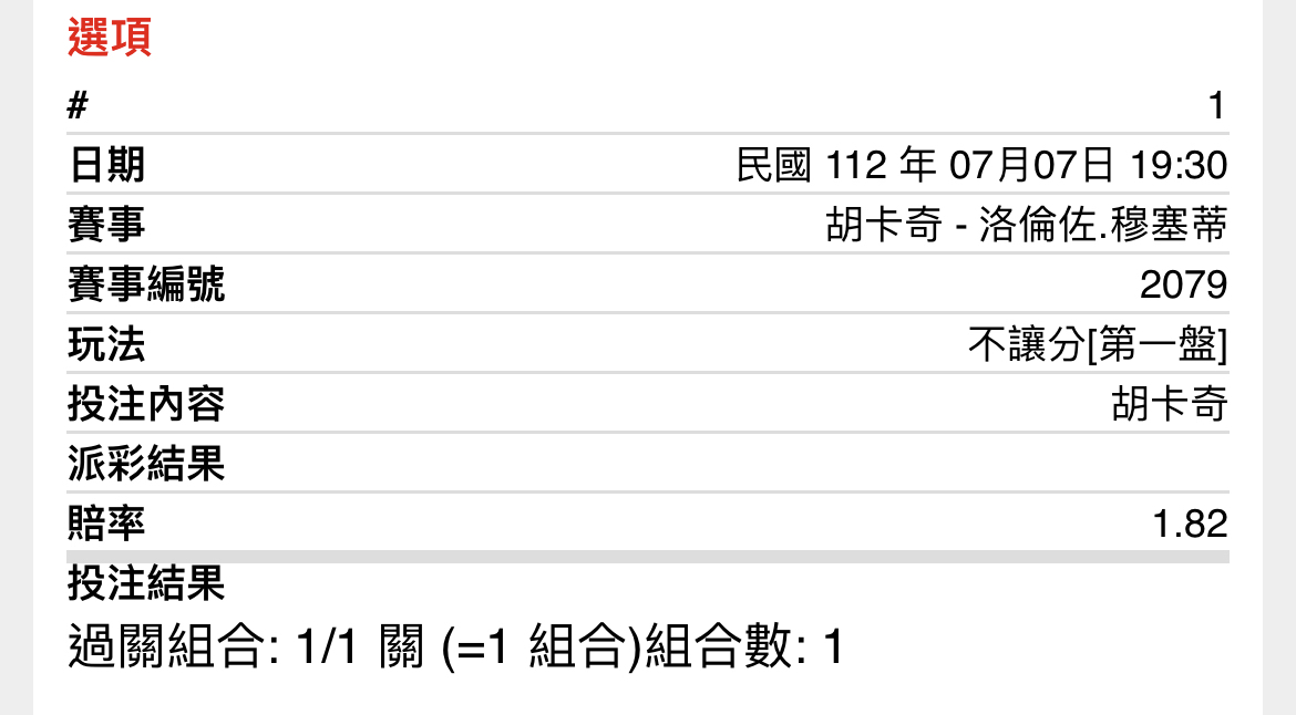 -- ※ 發信站: 批踢踢實業坊(www.ptt-website.tw), 來自: 27.51.40.16 (臺灣) ※ 文章網址: https://www.ptt-website.tw/SportLottery/M.1688726701.A.C92 ※ 編輯: binbinyolee (27.51.40.16 臺灣), 07/07/2023 18:45:16