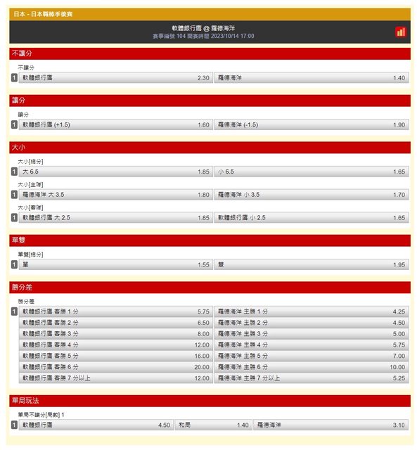 推 pandalove: 橫濱2.5大,軟銀2.5大 39.10.39.7 10/14 12:07