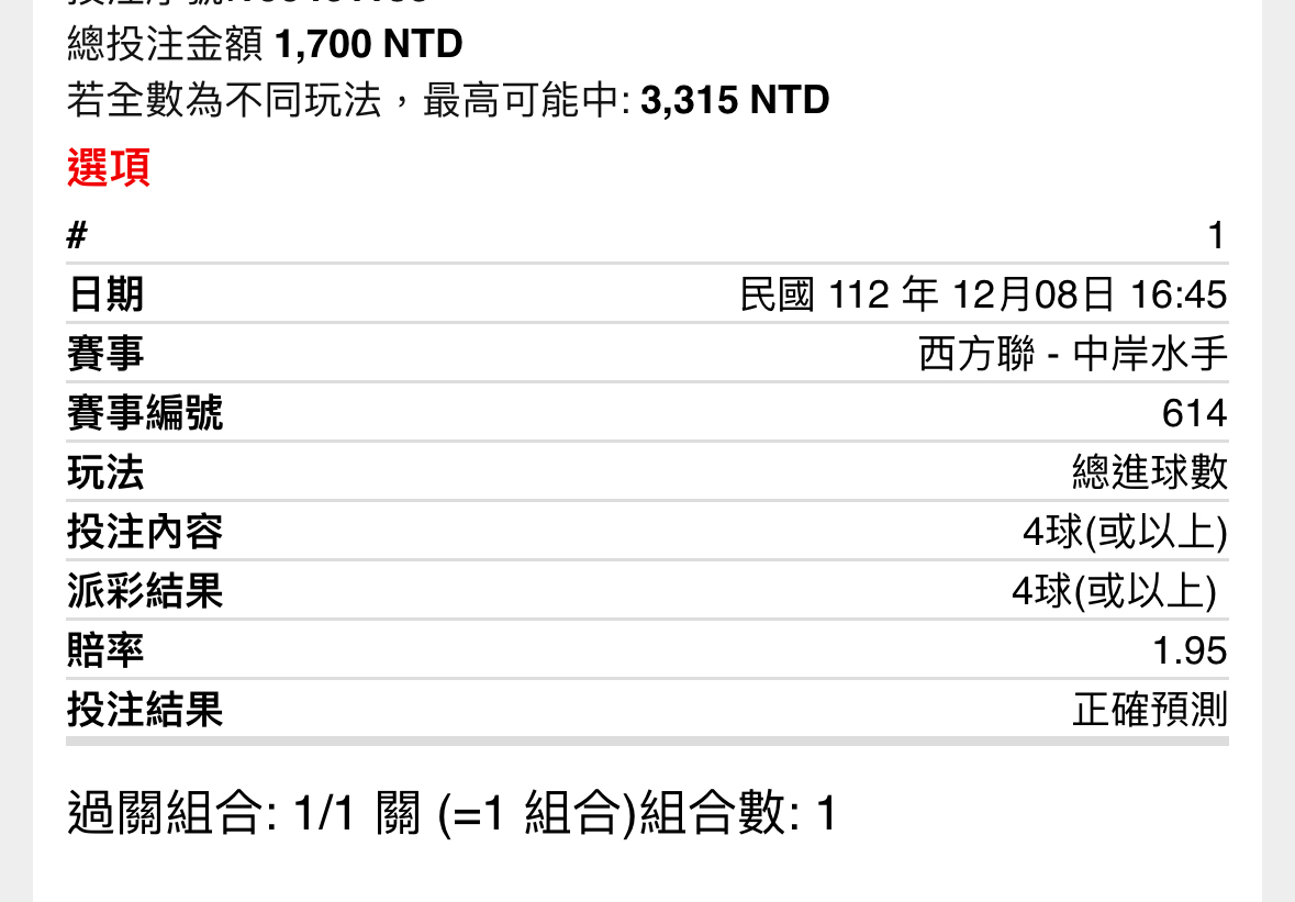 推 b08297: 死亡4+,還好剛剛有買第4球水手打平 101.12.88.149 12/08 18:34