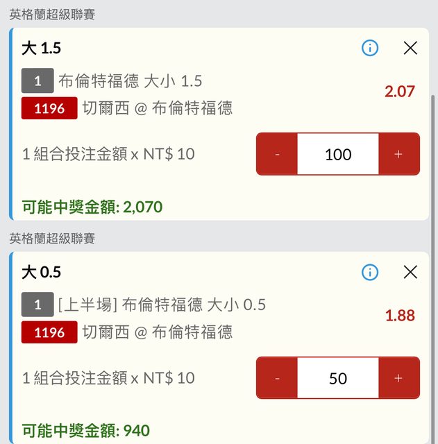 [上半場] 布倫特福德 大 0.5 1.88
