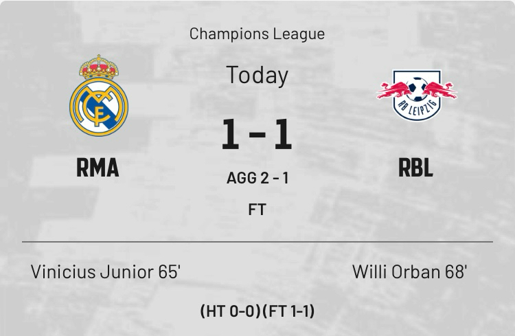 RB萊比錫2:1皇家馬德里 13.00