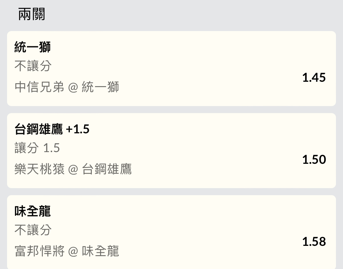 中信兄弟@統一獅 主(-1.5) 賠率1.94