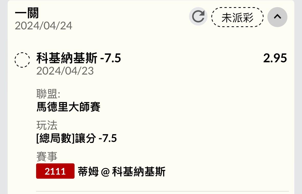 噓 galder: 雖然補到-7.5,但是賽前買的3盤、樂透、 42.70.79.147 04/24 00:17
