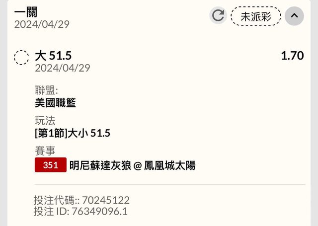 灰狼太陽第一節51.5大 1.70