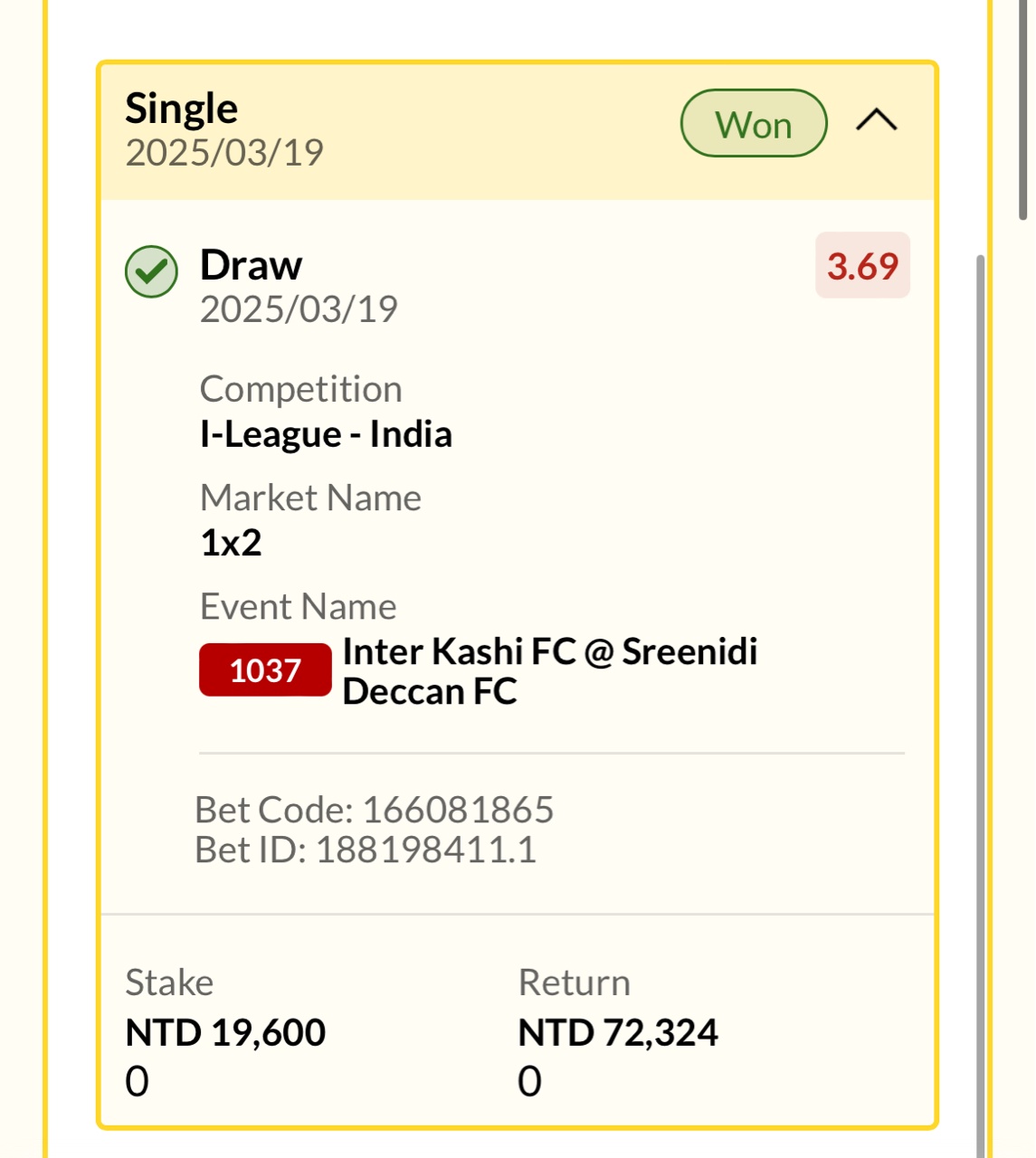 國際喀什 2 - 2 斯里尼迪德干 17' 國際喀什 HT-- 1:0 -- 48' 斯里尼迪德干 72' 斯里尼迪德干 90+1國際喀什 FT-- 2:2 -- 印甲 -- ※ 發信站: 批踢踢實業坊(www.ptt-website.tw), 來自: 125.230.12.103 (臺灣) ※ 文章網址: https://www.ptt-website.tw/SportLottery/M.1742390972.A.4E5