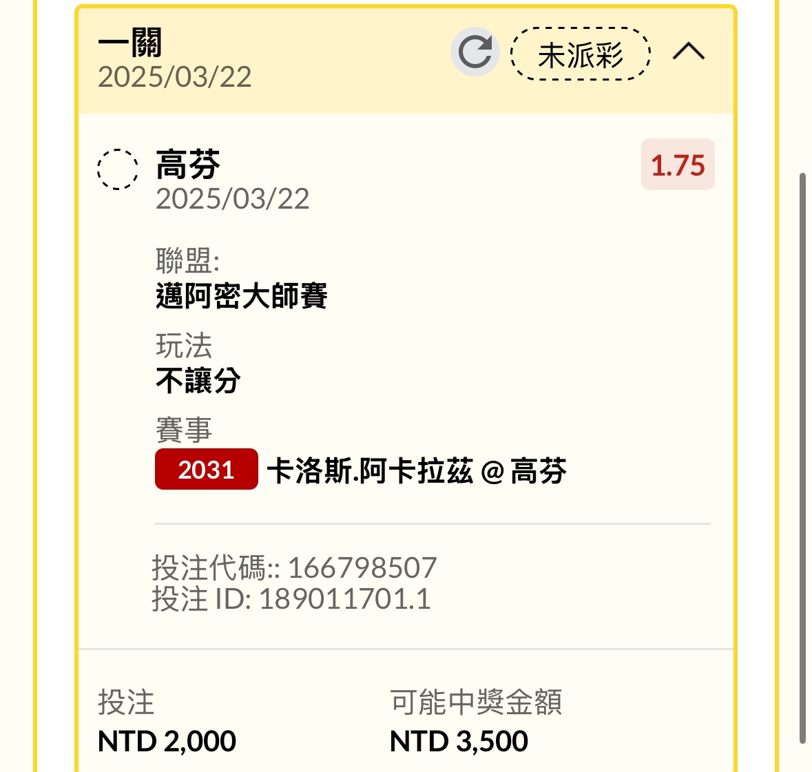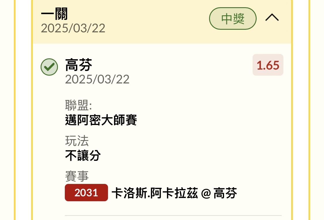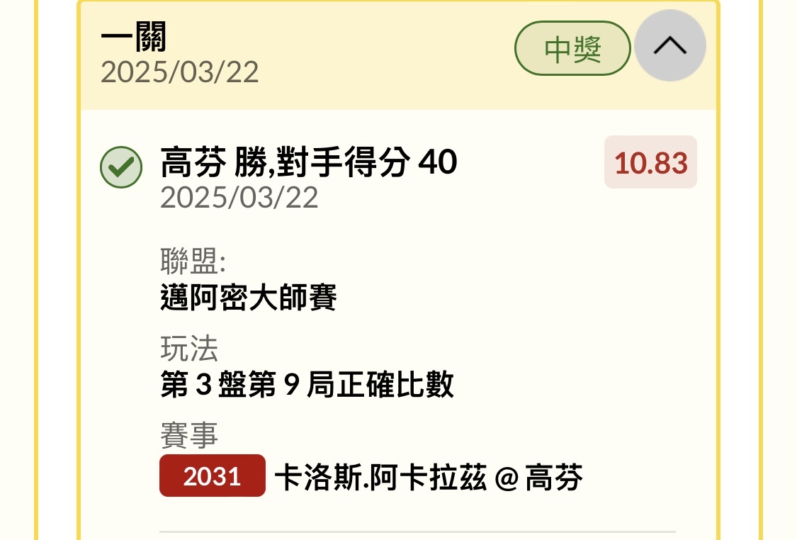 一 二 三 卡洛斯.阿卡拉茲 7 4 3 高芬 5 6 6 ----- Sent from JPTT on my iPhone -- ※ 發信站: 批踢踢實業坊(www.ptt-website.tw), 來自: 42.72.181.189 (臺灣) ※ 文章網址: https://www.ptt-website.tw/SportLottery/M.1742601793.A.C5E