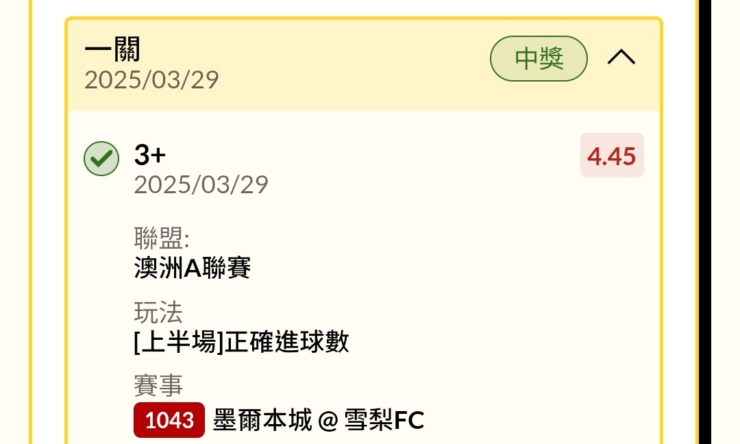 墨爾本城 3-2 雪梨FC 還是澳甲有比較合胃口 -- 運彩屢屢賽事取消「走地」 彩迷訐譙:開飯店還怕人吃 https://news.ltn.com.tw/news/society/breakingnews/3274899 -- ※ 發信站: 批踢踢實業坊(www.ptt-website.tw), 來自: 103.234.206.243 (臺灣) ※ 文章網址: https://www.ptt-website.tw/SportLottery/M.1743227560.A.99E