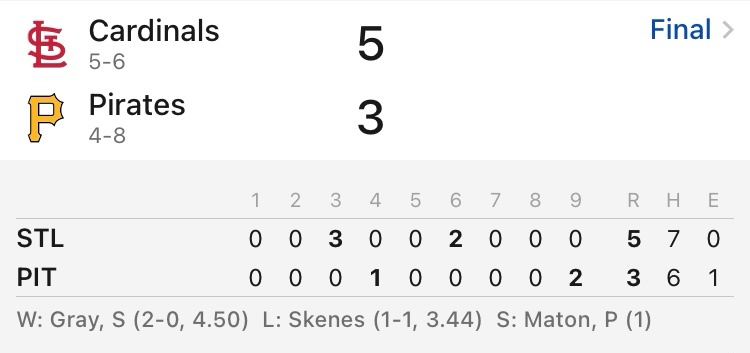 2025 Major League Baseball regular season PNC Park, Pittsburgh, Pennsylvania https://i.imgur.com/3gwpZGb.jpeg St. Louis Cardinals 4-6 Pittsburgh Pirates 4-7 匹茲堡海盜 勝 匹茲堡海盜2分 6.00 https://i.imgur.com/98W0sqV.jpeg 敬請齊推:鄭宗哲加油! 任務遊戲: 倘若本場見證Tsung-Che Cheng初登板 只要海盜獲勝→即贈壹位臺灣球迷新臺幣999元 -- ※ 發信站: 批踢踢實業坊(www.ptt-website.tw), 來自: 42.78.14.96 (臺灣) ※ 文章網址: https://www.ptt-website.tw/SportLottery/M.1744128009.A.86E