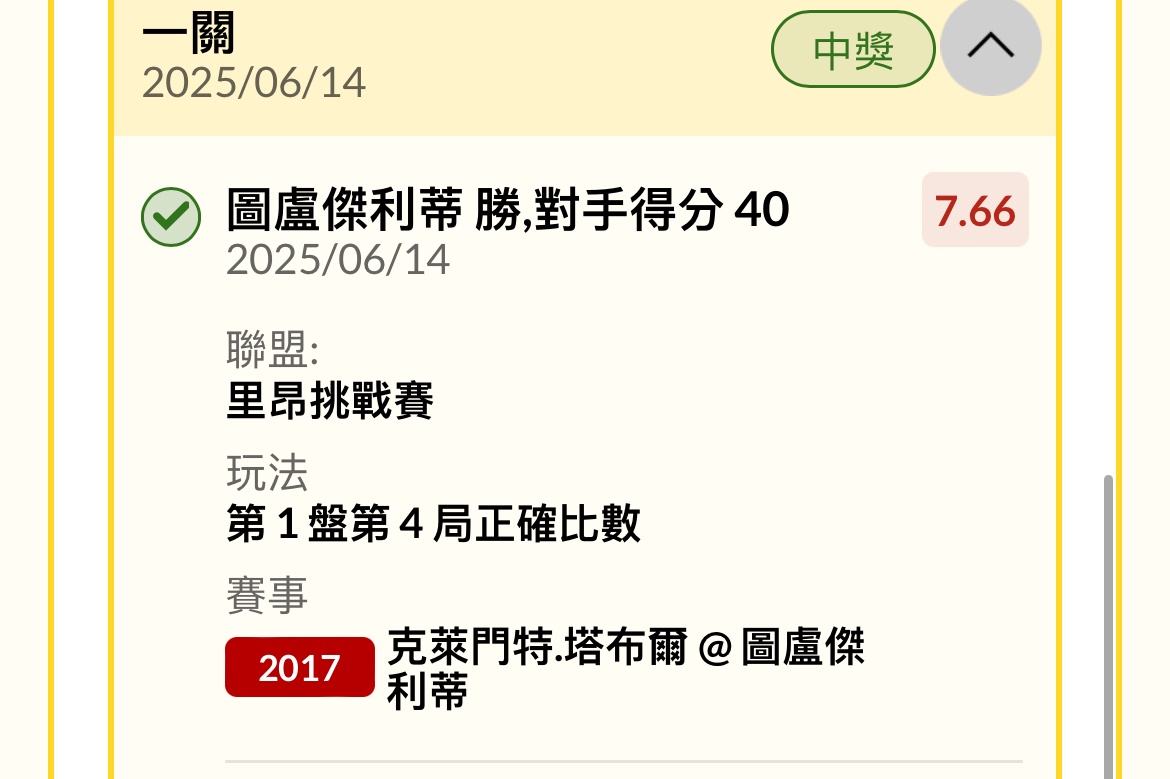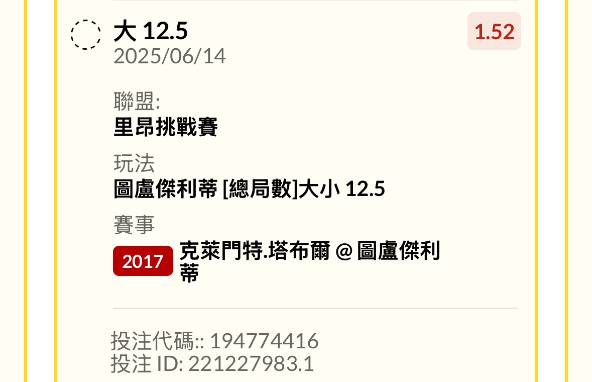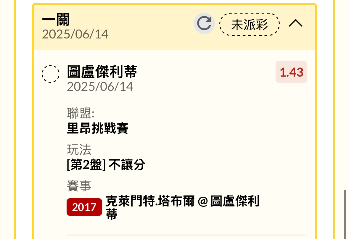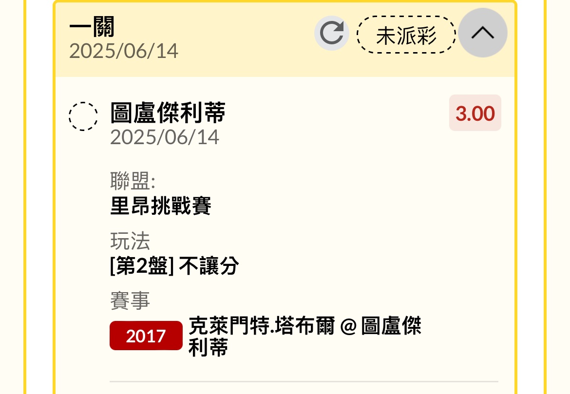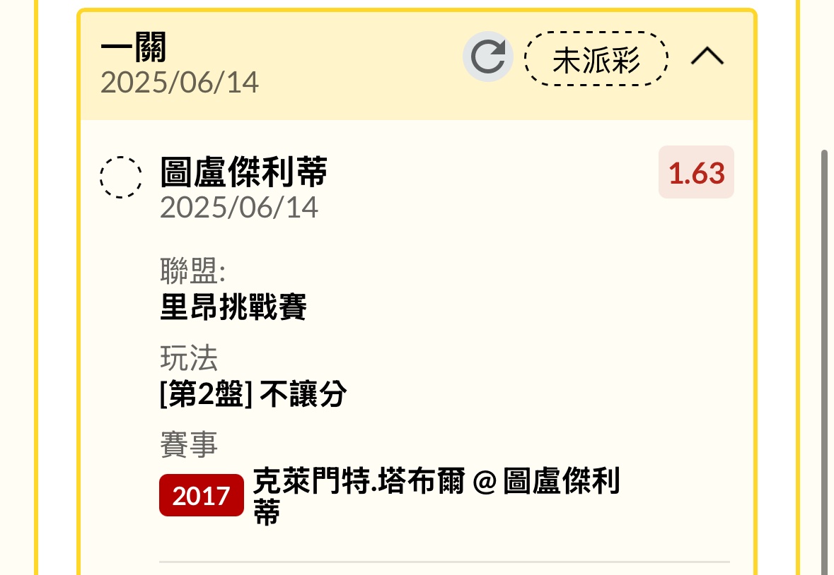 克萊門特.塔布爾 @ 圖盧傑利蒂 0:2 第一盤 1:6 第二盤 5:7 第三盤 ----- Sent from JPTT on my iPhone -- ※ 發信站: 批踢踢實業坊(www.ptt-website.tw), 來自: 111.83.2.2 (臺灣) ※ 文章網址: https://www.ptt-website.tw/SportLottery/M.1749905411.A.A71